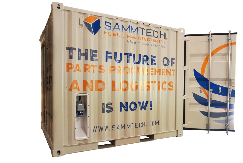 The Snowbird Additive Mobile Manufacturing platform (SAMM Tech) is a patented hybrid manufacturing system that revolutionizes parts procurement and logistics in the field. SAMM Tech provides an additive manufacturing system (3D printing) with subtractive manufacturing capabilities (milling and routing heads) to produce large format, metal or composite parts. The patented gantry platform is constructed inside standard shipping containers, ensuring that the platform can be shipped to any location in the world. This concept is patented by US Patent No. 10,434,712 B1. As of 2022, Snowbird is the sole owner of this patent.
